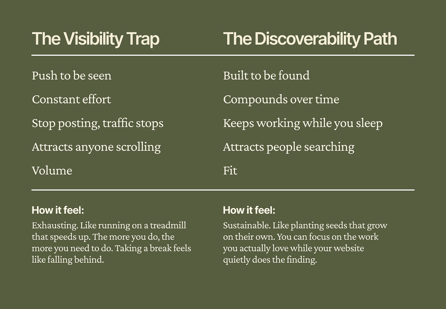 Discoverability works differently. It means your website is built so that when the right person is searching for exactly what you offer, they find you. Not because you were shouting the loudest, but because you named things clearly, spoke to a specific experience, and built something that naturally surfaces when someone needs it.