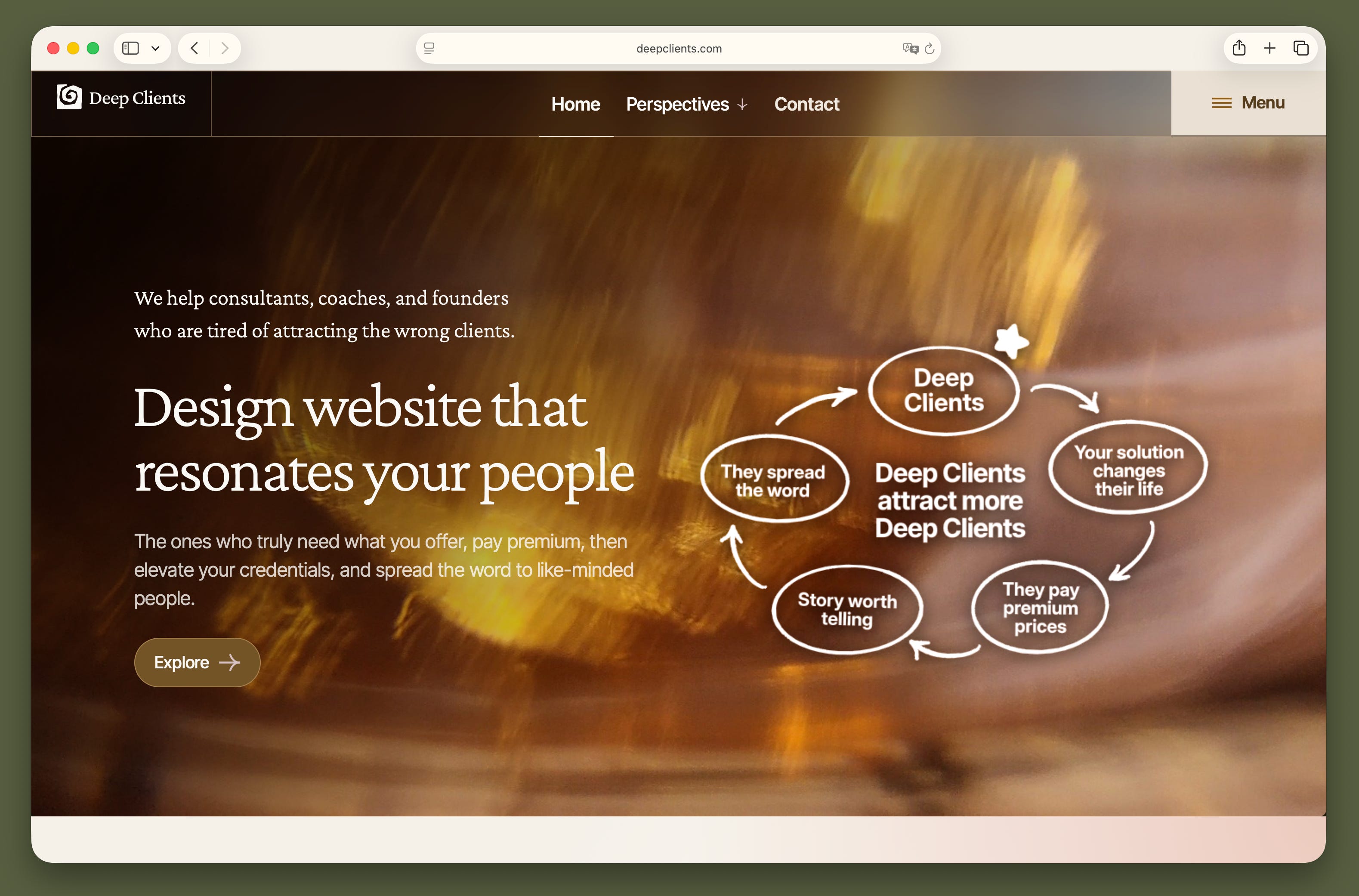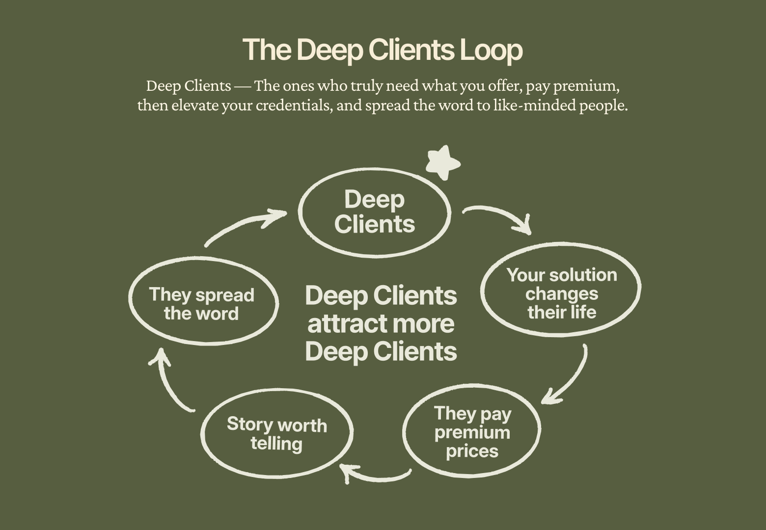 That’s the Deep Clients loop in action. The right people find you. Your work creates real change in their lives. That change is visible. They tell others. And those others, because they come from the same kind of person, arrive pre-qualified.